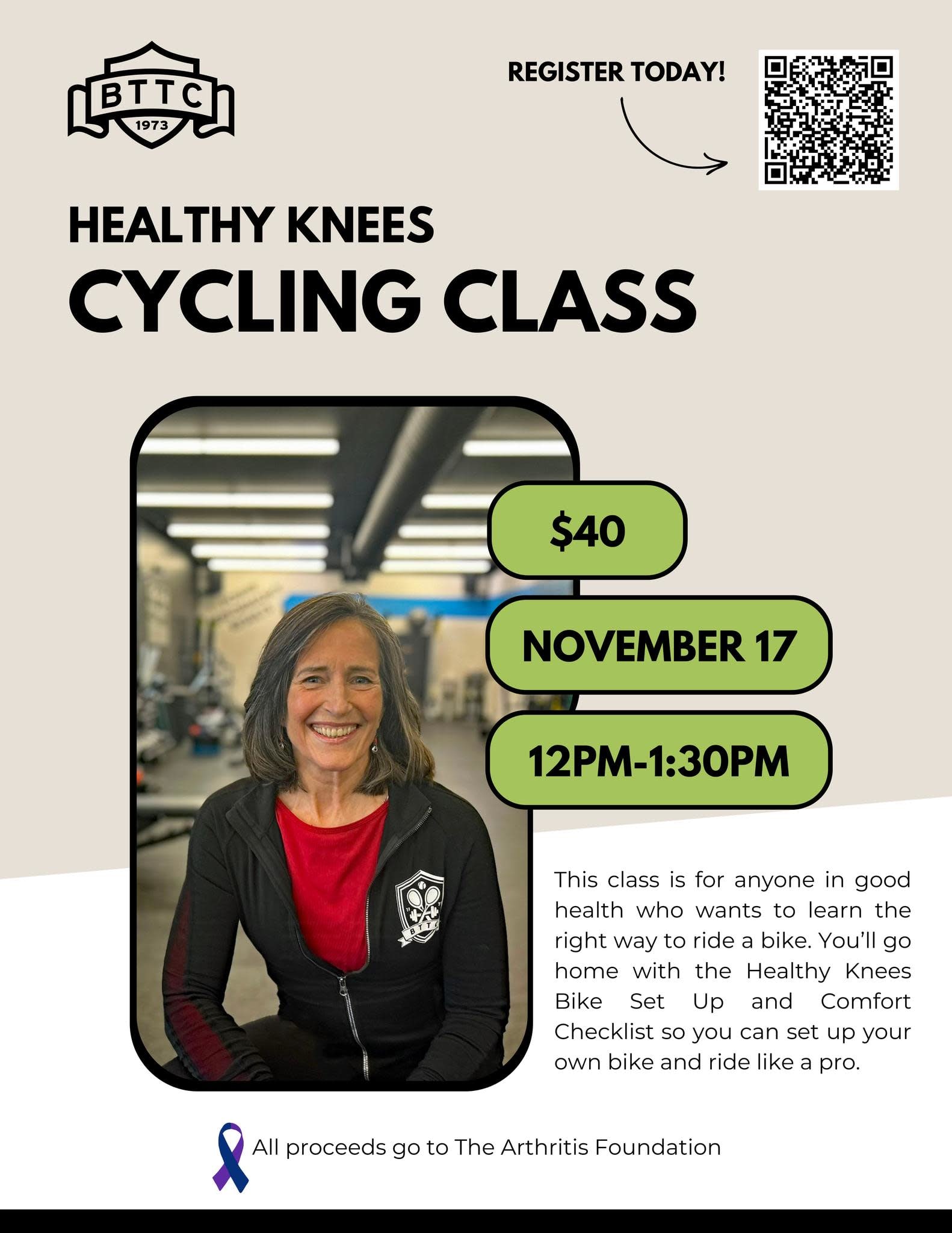 100% of all workshop fees will be donated to the Arthritis Foundation.