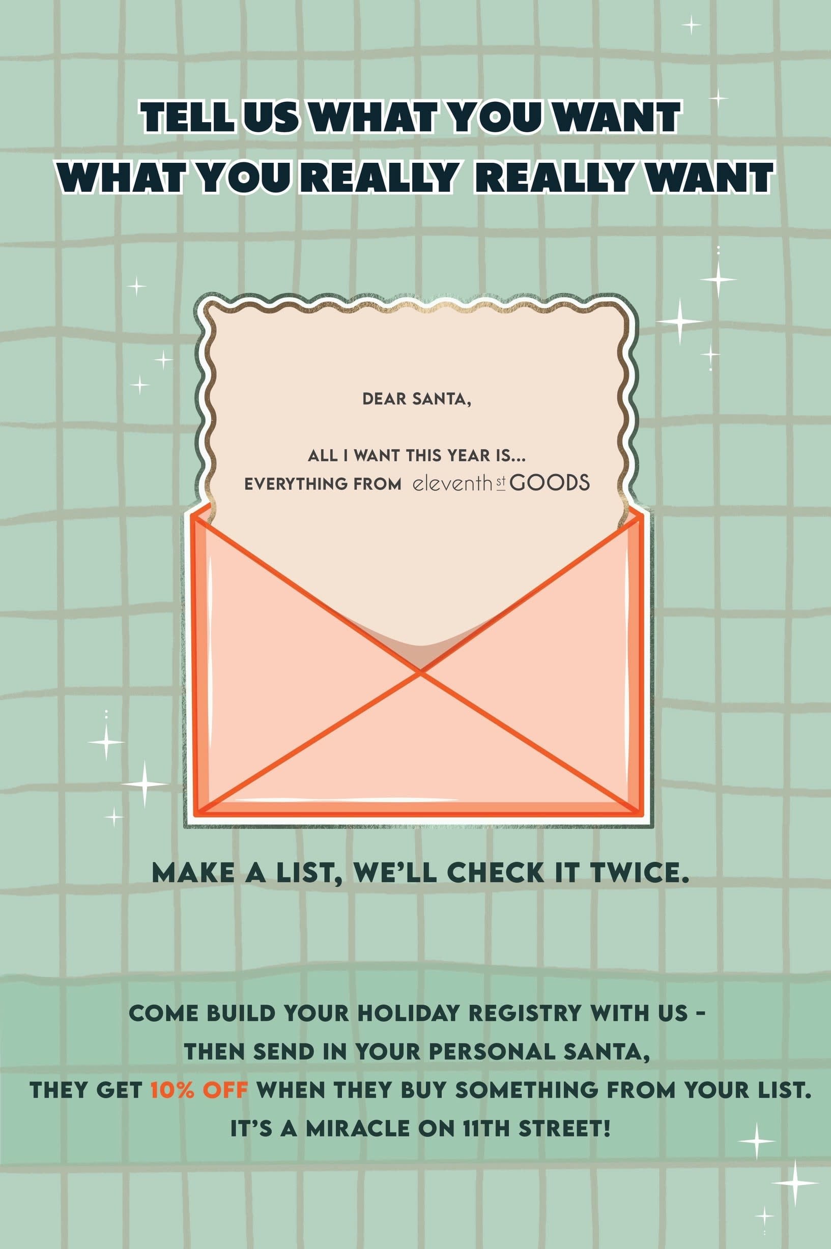Build your holiday gift registry w. Eleventh St Goods, share it with your friends and family.